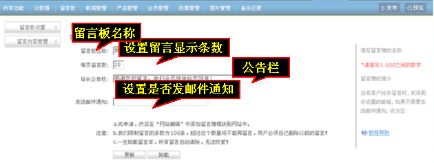 在留言本设置主要填写留言板名称、设置每页留言数、设置站长公告栏、设置发邮件通知(当有客户给你留言时, 发送到您设置的邮箱, 如果不需要发送邮件通知, 设为空),点击“更新”便完成留言板设置。